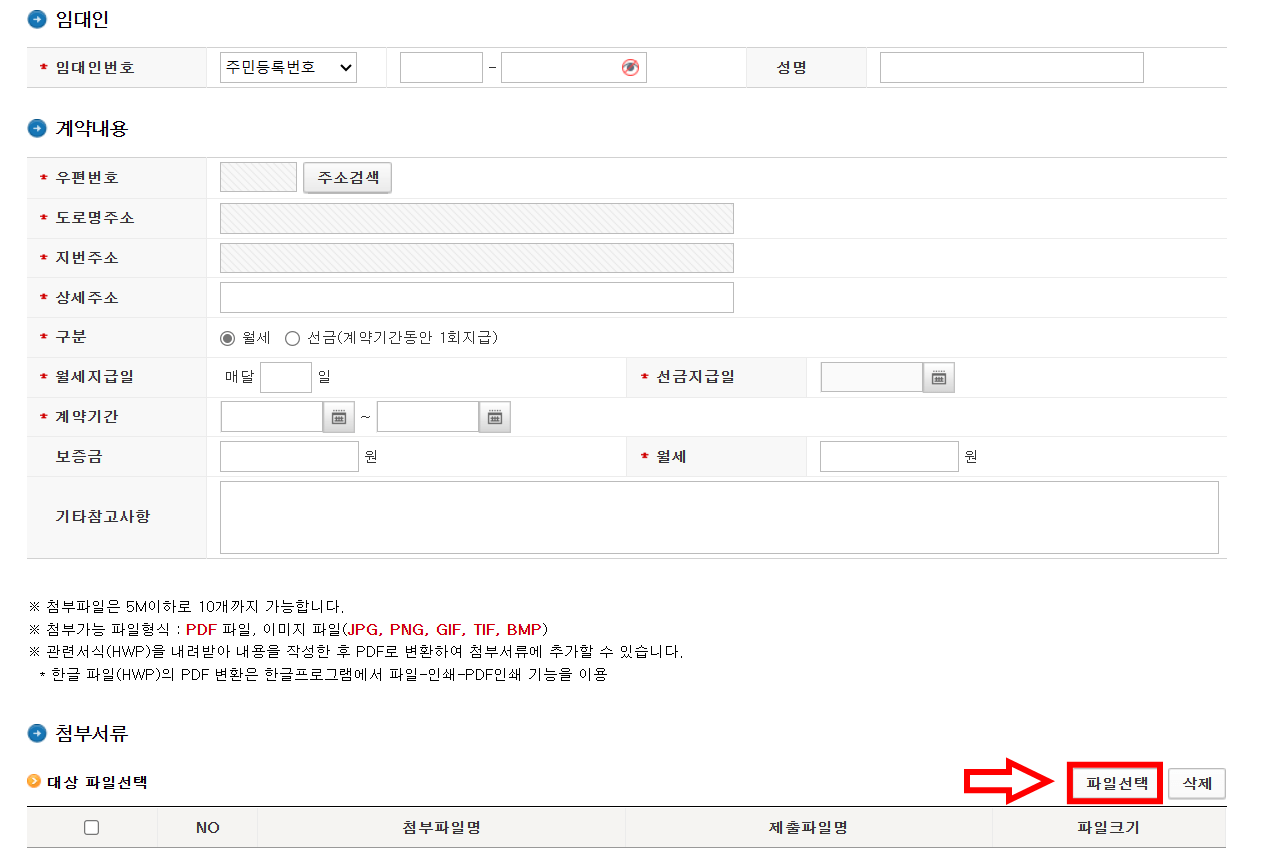 4. 임대차 계약서에 표기된 임대인의 정보를 입력한 후 하단 첨부서류 옆 파일선택에 신분증사진, 임차료지급 확인서(은행 이체확인증), 임대차계약서를 첨부해야 합니다.