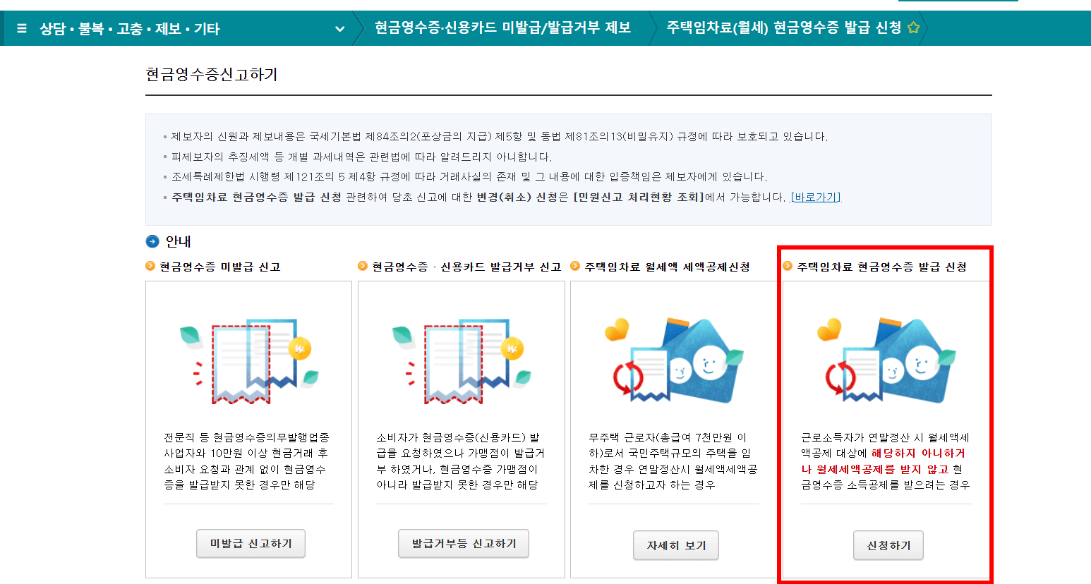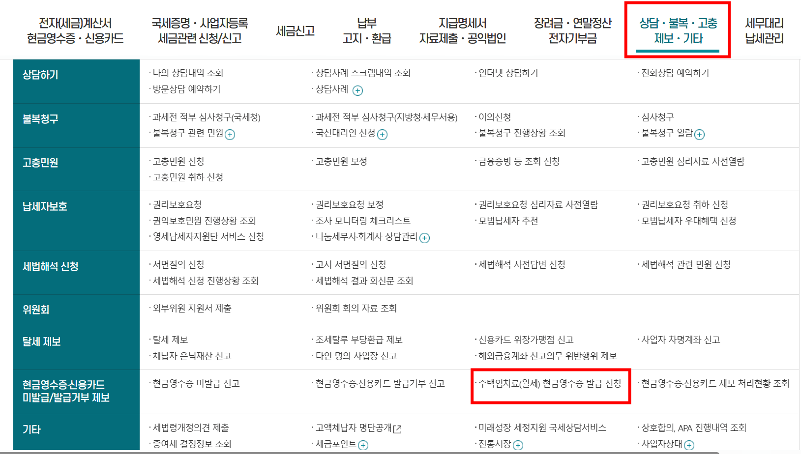 2. 첫 번째 보이는 화면 오른쪽 상단 위 상담, 불복, 고충, 제보, 기타에서 하단 빨간 박스 주택임차료(월세) 현금영수증 발급신청 클릭합니다.